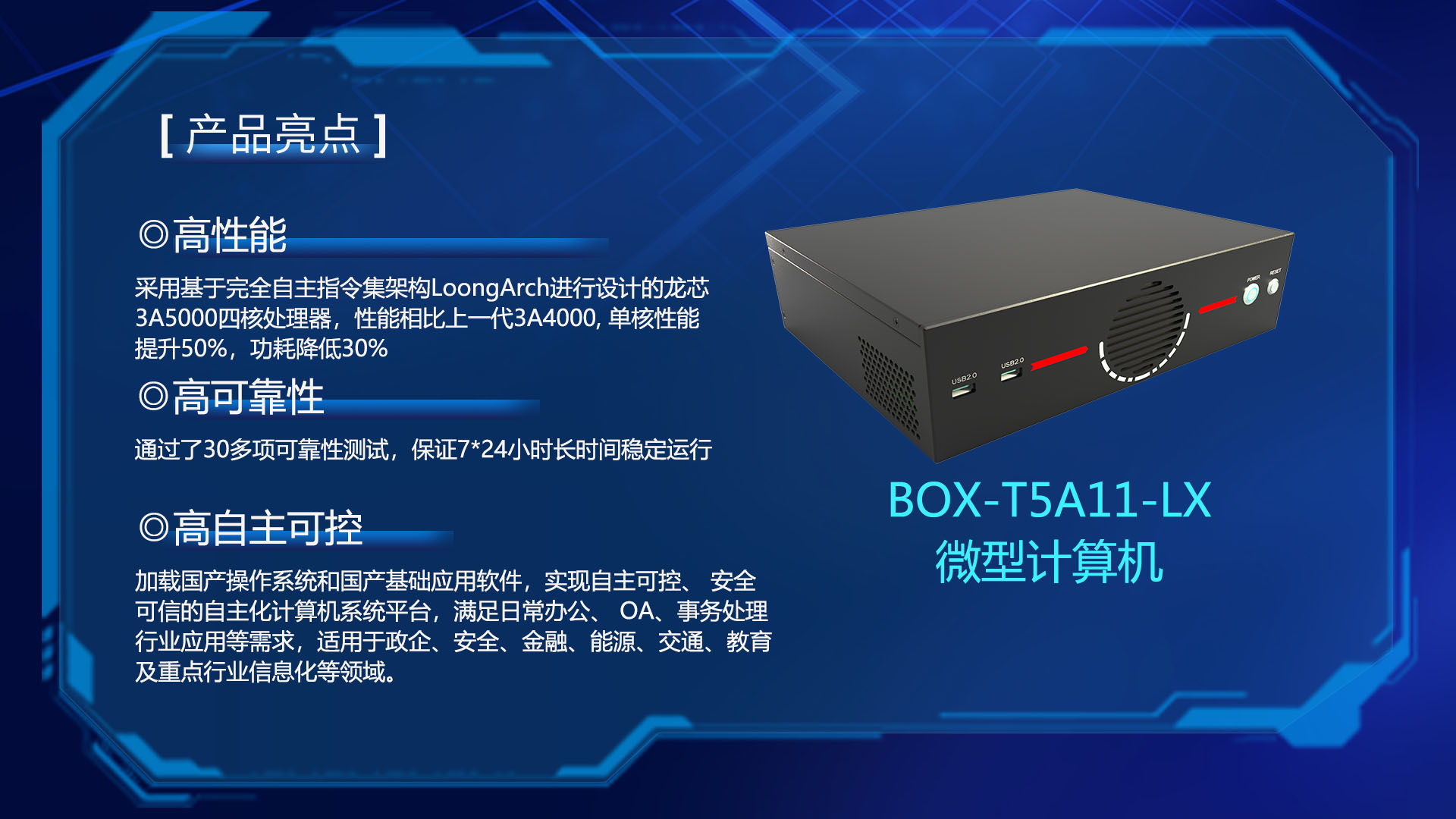 研恒(特控)BOX-T5A11-LX微型計算機采用基于完全自主指令集架構(gòu)LoongArch進行設(shè)計的龍芯3A5000四核處理器,性能相比上一代3A4000, 單核性能提升50%,功耗降低30%,指令集系統(tǒng)架構(gòu)承載的軟件生態(tài)走向完全自主。整機采用純工業(yè)設(shè)計,通過了30多項可靠性測試,保證設(shè)備7*24小時長時間穩(wěn)定運行。配套國產(chǎn)BIOS,加載國產(chǎn)操作系統(tǒng)和國產(chǎn)基礎(chǔ)應(yīng)用軟件,實現(xiàn)自主可控、 安全可信的自主化計算機系統(tǒng)平臺,滿足日常辦公、 OA、事務(wù)處理,行業(yè)應(yīng)用等需求,適用于政企、安全、金融、能源、交通、教育及重點行業(yè)信息化等領(lǐng)域。