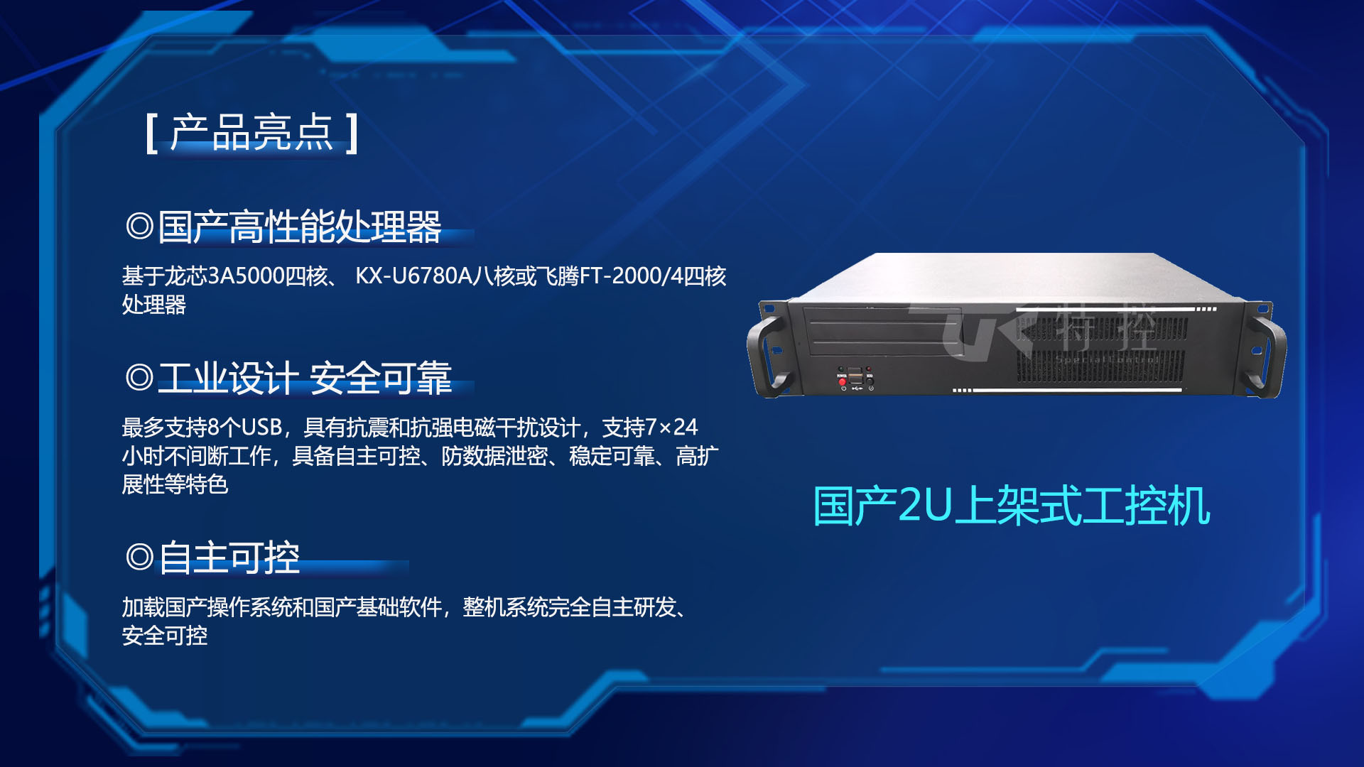 研恒(特控)國產(chǎn)2U上架式工控機基于龍芯3A5000四核、 KX-U6780A八核或飛騰FT2000/4四核處理器,配套國產(chǎn)BIOS, 加載國產(chǎn)操作系統(tǒng)和國產(chǎn)基礎(chǔ)軟件,整機系統(tǒng)完全自主研發(fā)、安全可控。最多支持8個USB,具有抗震和抗強電磁干擾設(shè)計,支持7×24小時不間斷工作,具備自主可控、防數(shù)據(jù)泄密、穩(wěn)定可靠、高擴展性等特色。