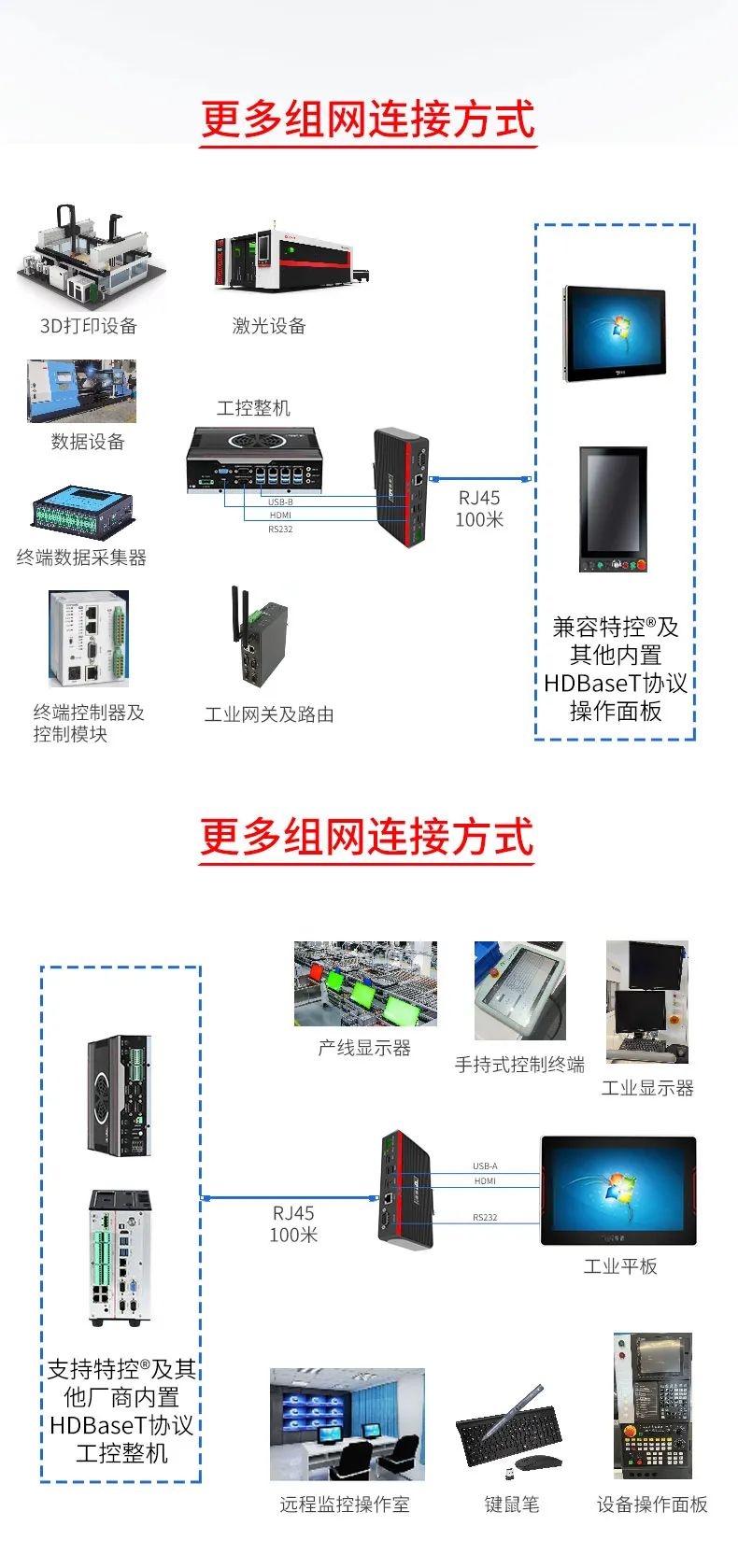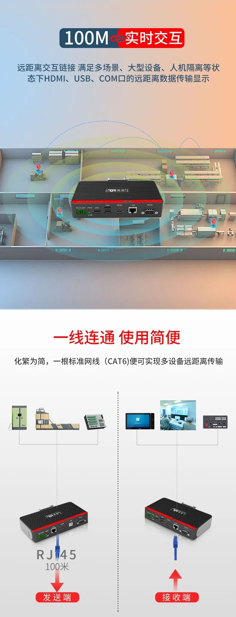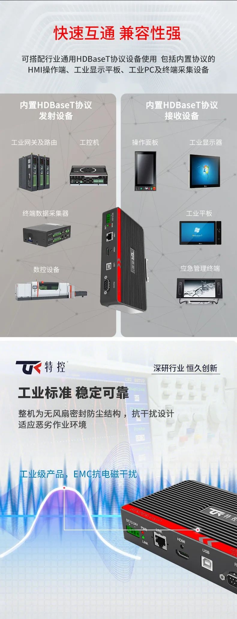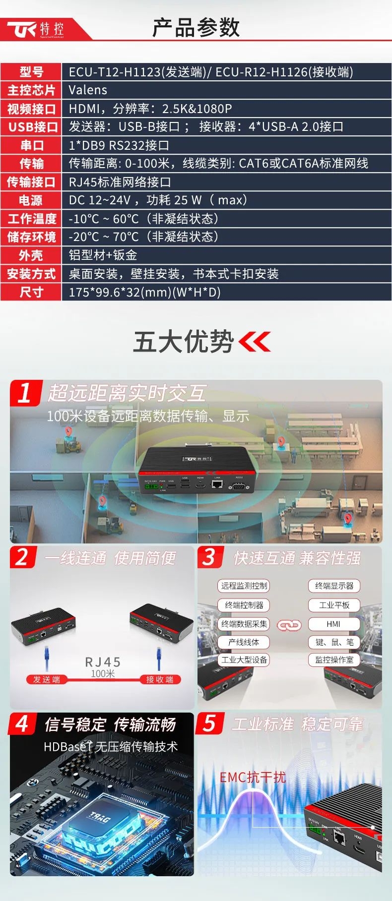 在大型裝備、自動(dòng)化產(chǎn)線、激光及數(shù)控行業(yè)等需要遠(yuǎn)距離信號(hào)傳輸場景中,傳統(tǒng)HDMI線纜存在信號(hào)衰減、傳輸距離限制、布線不便等問題,這極大地影響顯示端的成像質(zhì)量和雙向數(shù)據(jù)的穩(wěn)定性和時(shí)效性。為此,特控研發(fā)出抗干擾性強(qiáng)、數(shù)據(jù)零延時(shí)、兼容性強(qiáng)的HDMI星光遠(yuǎn)傳ECU-TR12。特控ECU-TR12采用進(jìn)口高性能芯片設(shè)計(jì),總體由發(fā)射端T12和接收端R12兩部分組成,發(fā)射端可將2.5k高清視頻信號(hào)、USB和RS232數(shù)據(jù)信號(hào)進(jìn)行整合,通過標(biāo)準(zhǔn)網(wǎng)線(CAT6)遠(yuǎn)距離傳輸?shù)浇邮斩?,無信號(hào)衰減,接收端通過高性能智能芯片解碼,可以給用戶高速高質(zhì)量的數(shù)據(jù)及顯示交互體驗(yàn),整機(jī)外殼采用鋁合金散熱設(shè)計(jì),機(jī)身堅(jiān)固小巧獨(dú)具工業(yè)美感,可搭配行業(yè)通用HDBeasT協(xié)議設(shè)備使用,包括內(nèi)置協(xié)議的HMI操作端、工業(yè)顯示平板、工業(yè)PC及終端采集設(shè)備。